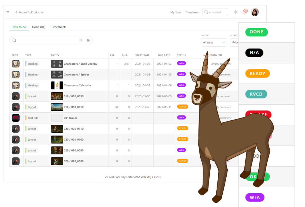 Streamlined and intuitive software is quicker to use and easier to get started with. With Kitsu, you can start your projects without the need for a consultant or intensive training.